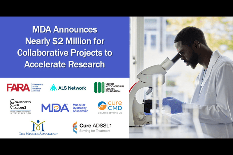 La asociación de la MDA en materia de investigación incluye subvenciones de investigación colaborativa con ALS Network, Cure ADSSL1, Coalition to Cure Calpain 3, Cure CMD, Friedreich's Ataxia Research Alliance, The Myositis Association y United…